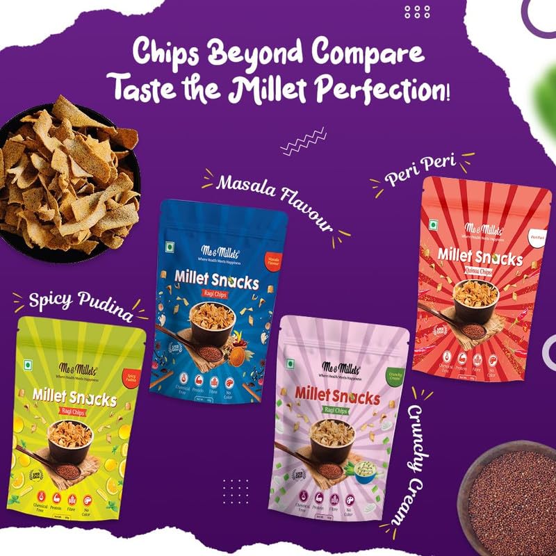Me & Millets Ragi Chips (Pack of 4, Each 80G) Crunchy Cream, Masala, Peri Peri & Spicy Pudina Flavor Combo, Healthy & Tasty Multi-Millet Chips, No Maida, Source of Protein & Fiber, Ready to Eat Snacks