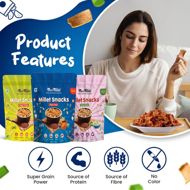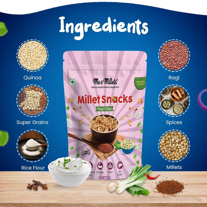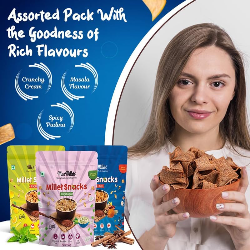 Me & Millets Snacks Assorted Packs - 80g (Pack of 3) Ragi Chip Crunchy Cream, Ragi Chips Masala Flavour, Millets Chips Spicy Pudina