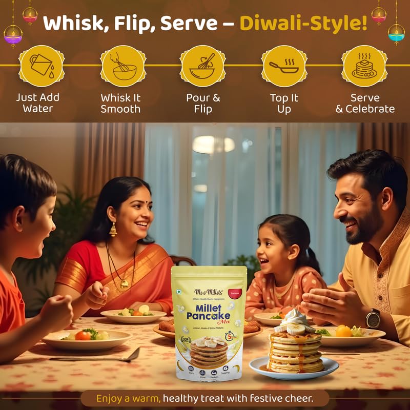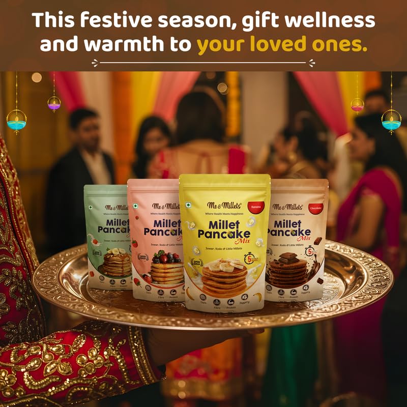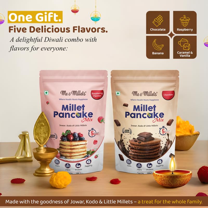 Home Diwali Gifts Me & Millets Pancake Mix Gift Pack (150g x4) 鈥 Caramel Vanilla, Banana, Raspberry, Chocolate | Jaggery Sweetened | No Maida | Eggless | Jain Friendly | Diwali Gift for Family, Friends & Corporate