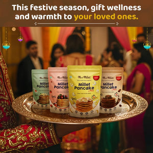 The Me & Millets Pancake Mix Gift Pack offers a delightful and wholesome way to enjoy breakfast or snacks during the festive season. This pack includes four delicious flavors鈥擟aramel Vanilla, Banana, Raspberry, and Chocolate (150g each)鈥攁ll naturally sweetened with jaggery for a healthier touch. Made without maida (refined flour), the mixes are eggless and Jain-friendly, making them suitable for a wide range of dietary preferences. Perfectly curated as a thoughtful Diwali gift, this pancake mix pack is ideal for sharing with family, friends, and corporate colleagues who appreciate tasty and nutritious treats.