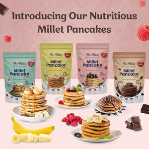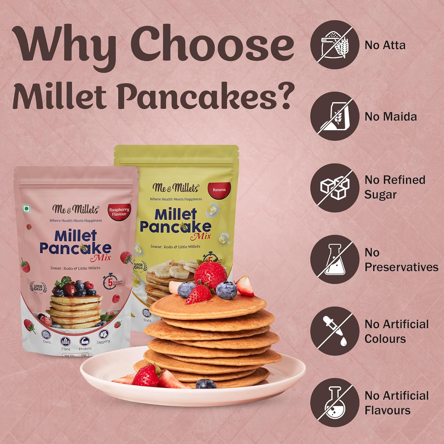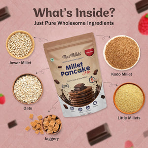 - Me & Millets Chocolate and Banana Millet Pancake mix filled with goodness of jowar, kodo & little millets. No wheat and palm oil at all. It has more protein and fibre in comparison to other regular pancake mixes.