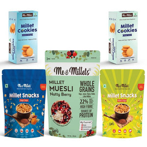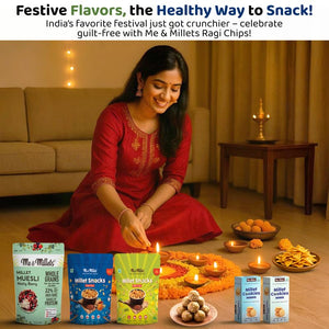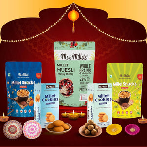 The Me & Millets Gift Pack is a wholesome and nutritious selection designed to delight your loved ones this Diwali. It features two delicious millet cookies ragi and Jowar (75g each) long with flavorful Pudina and Masala chips (80g each), providing a perfect balance of sweet and savory snacks. Adding to this, the pack includes a generous 400g pack of Millet Muesli with Berry & Nuts, packed with high protein and fiber for a healthy start to the day. Made without maida (refined flour), this gift set combines taste and wellness, making it an ideal present for family and friends who appreciate nutritious, guilt-free treats during the festive season.