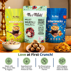 Me & Millets Gift Pack Ragi & Jowar Cookies(75g x1 each), Pudina & Masala Chips(80g x1 each), Millet Muesli (Berry & Nuts, 400g) | High Protein & Fiber | No Maida | Diwali Gift for Family & Friends