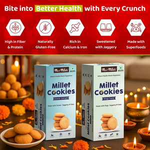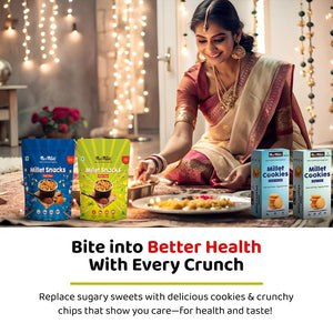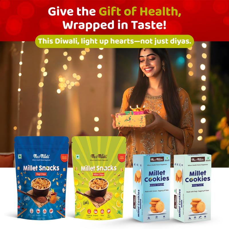 The Me & Millets Cookies & Chips Gift Pack is a delightful and healthy snack assortment perfect for Diwali gifting. This thoughtfully curated pack includes two varieties of nutritious millet-based cookies ragi and Jowar (75g each) known for their high fiber content and wholesome goodness. Complementing the cookies are two flavorful chip options, Pudina and Masala (80g each), offering a savory crunch without any maida (refined flour). Completely Jain-friendly and crafted to promote wellness, this gift pack is an ideal treat to share with family, friends, and corporate colleagues during festive celebrations or any special occasion.