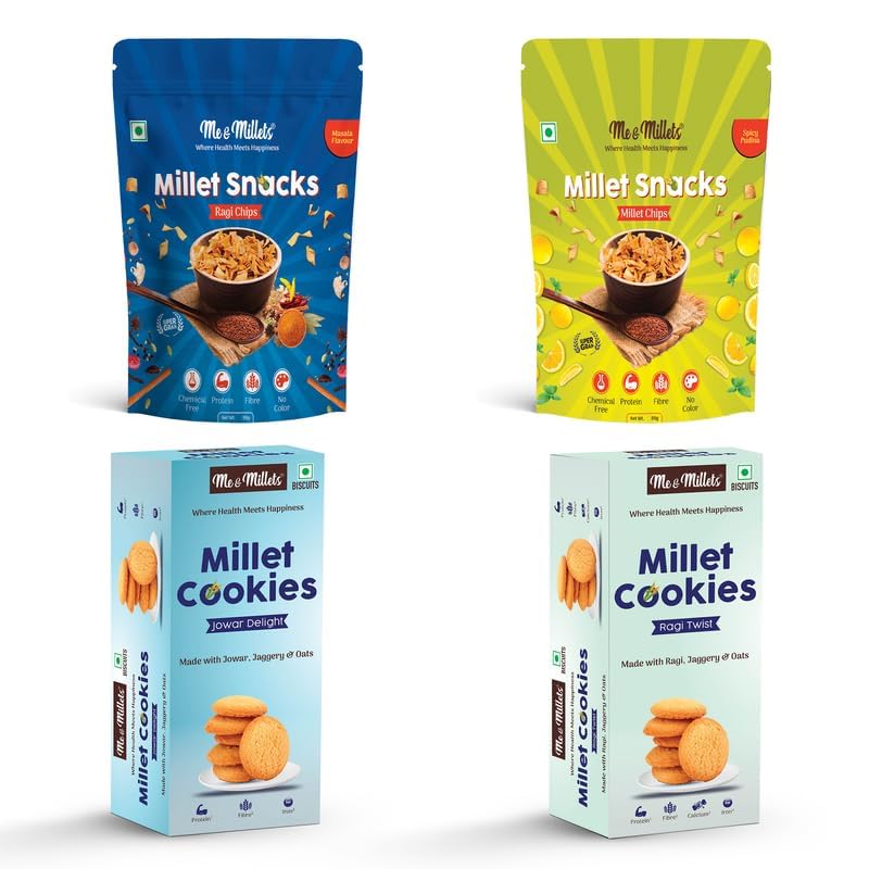 Me & Millets Cookies & Chips Gift Pack | Ragi, Jowar Cookies (75g x1 each) + Pudina, Masala Chips (80g x1 each) | No Maida | Jain Friendly | High Fiber | Diwali Gift for Family, Friends & Corporate