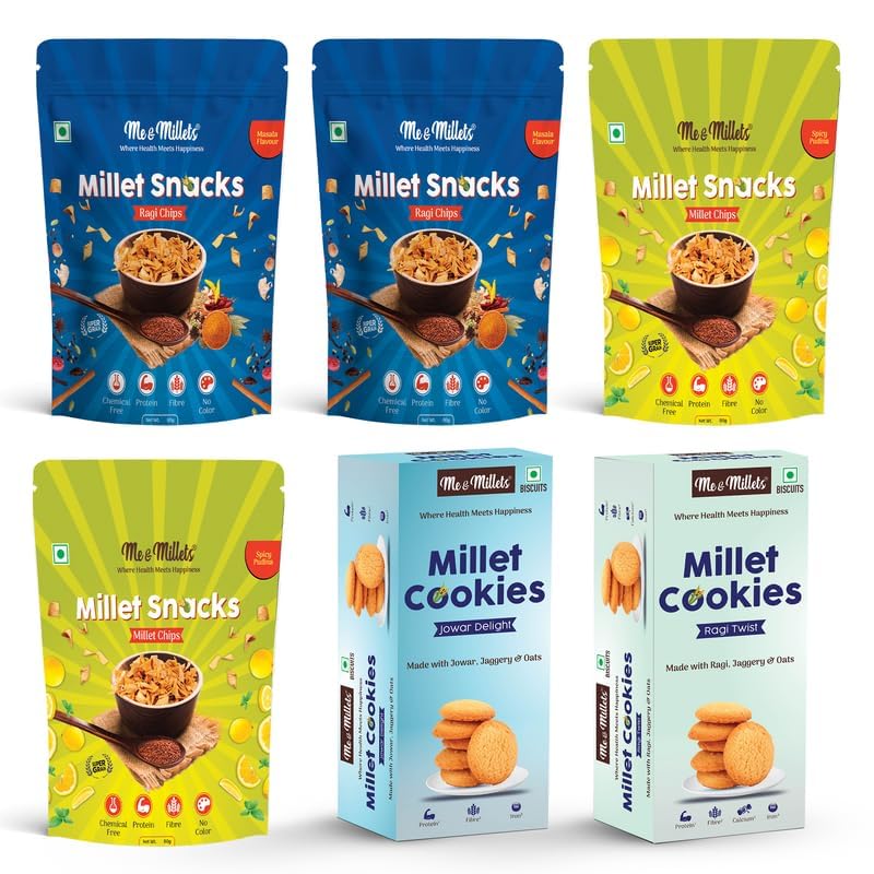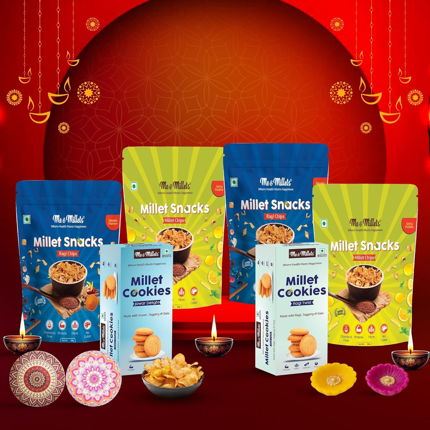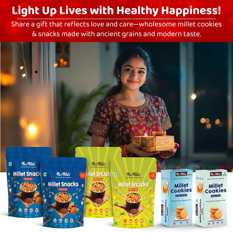 Me & Millets Cookies & Chips Gift Pack | Ragi, Jowar Cookies (75g x1 each) + Pudina, Masala Chips (80g x2 each) | No Maida | Jain Friendly | High Fiber | Diwali Gift for Family, Friends & Corporate