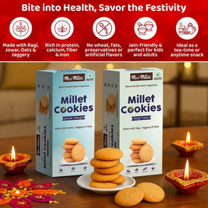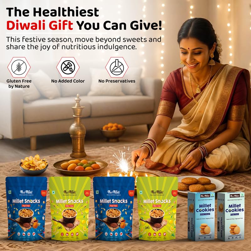 The Me & Millets Cookies & Chips Gift Pack is a delicious and nutritious snack collection, perfect for celebrating Diwali with your loved ones and colleagues. This pack features two wholesome millet cookies ragi and Jowar (75g each) known for their high fiber content and health benefits. Alongside these, it includes two flavorful varieties of chips pudina and Masala (80g each, two packs each) offering a savory and satisfying crunch. Made without any maida (refined flour) and completely Jain-friendly, this gift pack combines taste and wellness in every bite. Its an ideal choice for gifting to family, friends, and corporate teams, spreading joy and good health during the festive season.