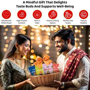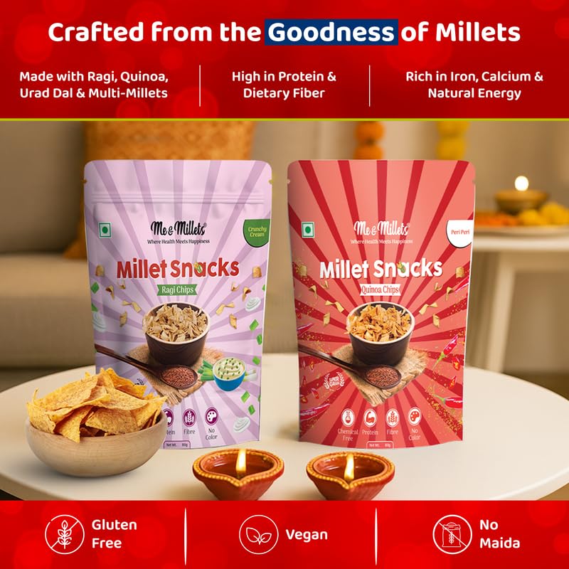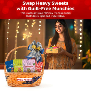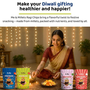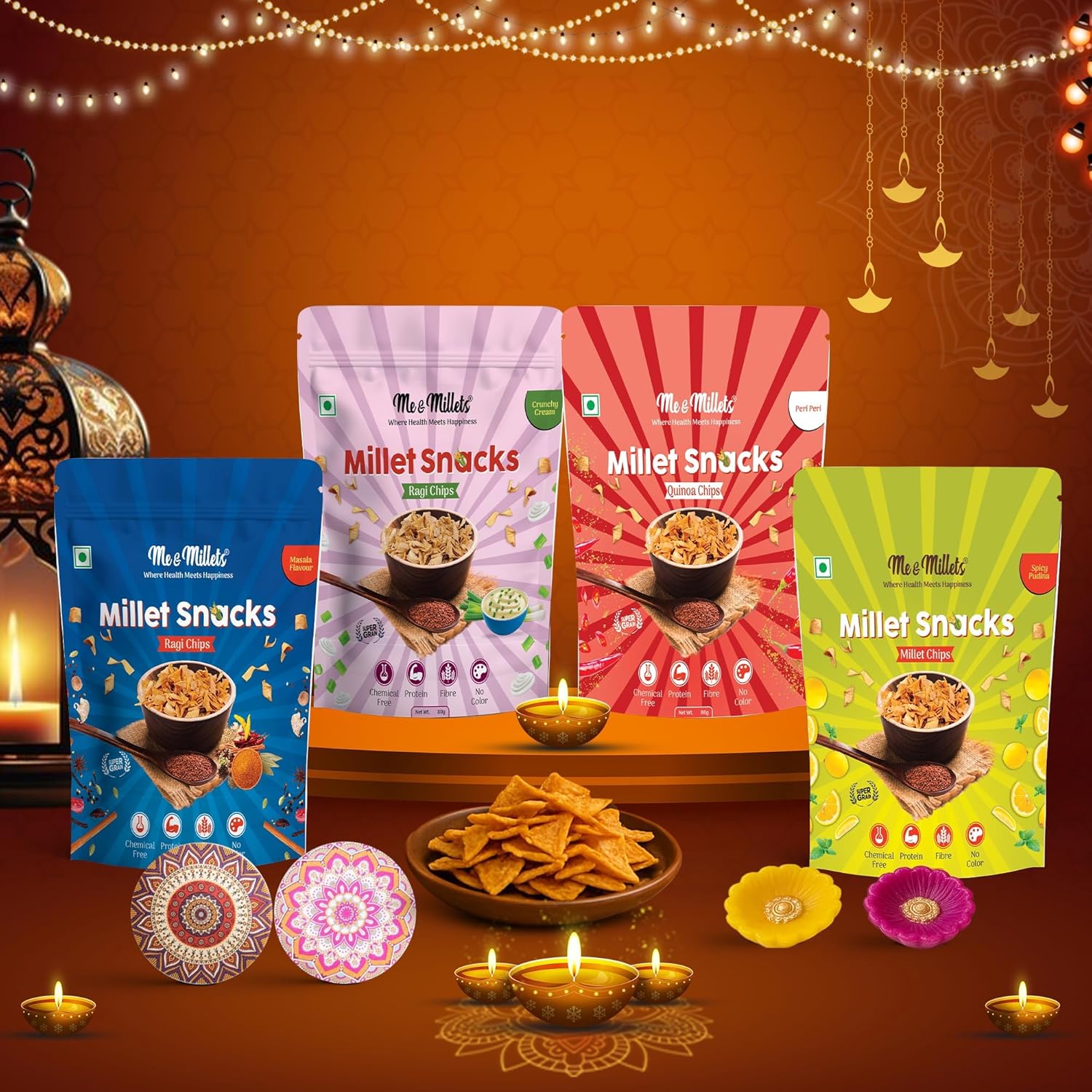 The Me & Millets Ragi Chips Gift Pack offers a delicious and healthy snacking experience with four flavorful varieties crunchy Cream, Masala, Peri Peri, and Pudina (80g each). Made from nutrient-rich ragi, these chips are high in protein and fiber, promoting better digestion and sustained energy. Free from maida (refined flour), they provide a guilt-free indulgence that is perfect for health-conscious individuals. This vibrant flavor combo makes it an ideal Diwali gift, perfect for sharing with family, friends, and corporate colleagues who appreciate tasty and wholesome snacks during the festive season.