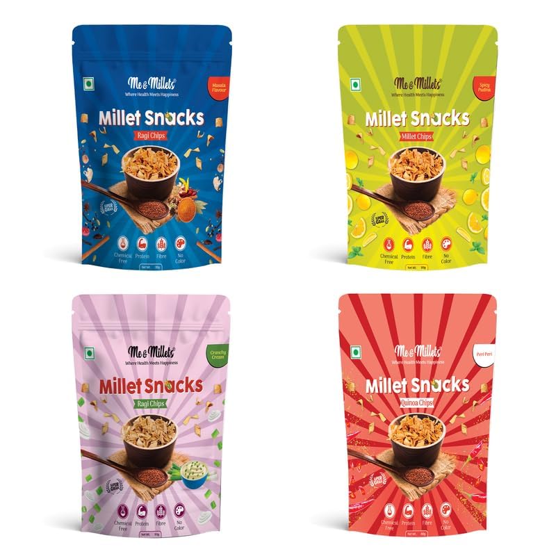 Me & Millets Ragi Chips Gift Pack of 4 (80g Each) | Crunchy Cream, Masala, Peri Peri, Pudina Flavor Combo | No Maida, High Protein & Fiber | Healthy Snack | Diwali Gift for Family & Friends